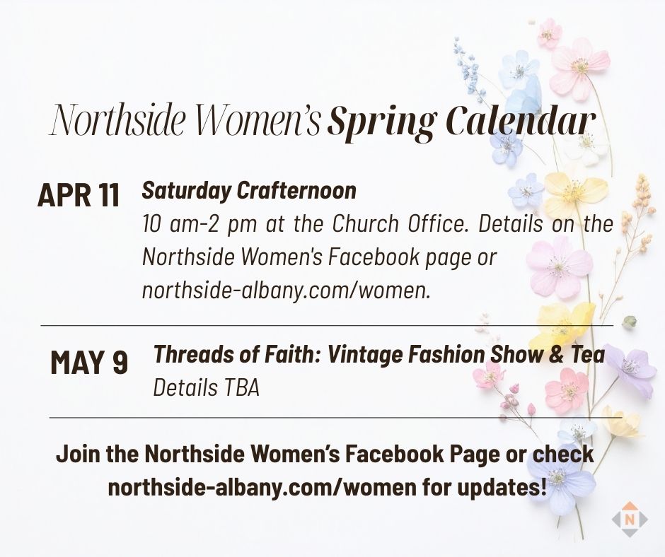 Connect with a Women's Ministry Leader Spring Calendar Crafternoon Threads of Faith: Tea & Fashion Show Click Here for Full Events Calendar